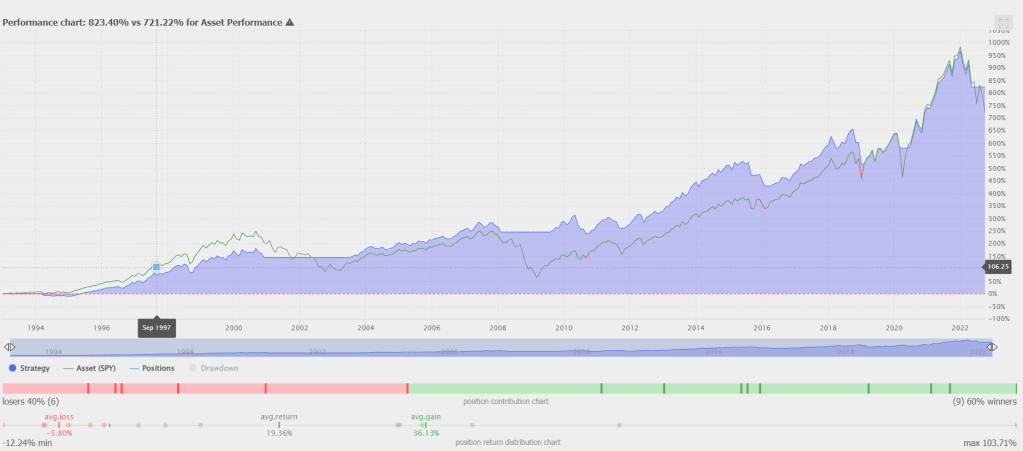Looks to do a pretty good job capturing the chunks of positive returns and avoiding big losses. I will point out, that these types of strategies often have some chop periods where signals are generated but there’s really no trend continuation (see 1994 for example). There are ways to potentially mitigate this but there’s no magic and I wanted to keep it simple. So the chart looks good now let’s look at the numbers from TrendSpider (great strategy tester from them by the way) to see some performance stats: