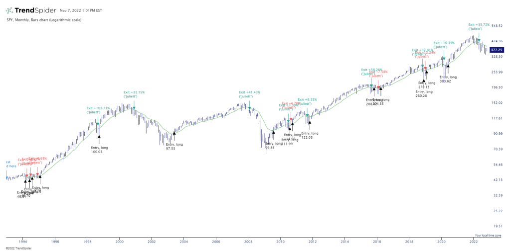 Here’s the first based on the slope of the 13 month EMA. The idea is to be long when this is moving up and exit when the slope turns down. Simple. Here’s a visual of the chart (from TrendSpider) with entries and exits: